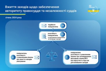 До Вищої ради правосуддя упродовж січня 2024 року надійшло 19 повідомлень про втручання у професійну діяльність суддів щодо здійснення правосуддя, про дії, що порушують гарантії незалежності суддів або підривають авторитет правосуддя.