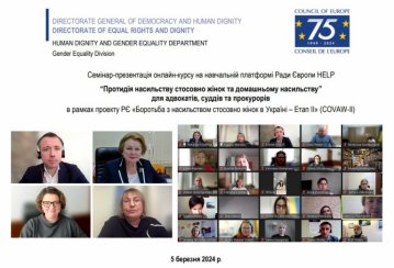 5 березня 2024 року відбувся семінар-презентація онлайн-курсу на навчальній платформі Ради Європи HELP “Протидія насильству стосовно жінок та домашньому насильству” для суддів, прокурорів та адвокатів, який реалізується в рамках проєкту Ради Європи “Боротьба з насильством стосовно жінок в Україні – Етап II” (COVAW-II).