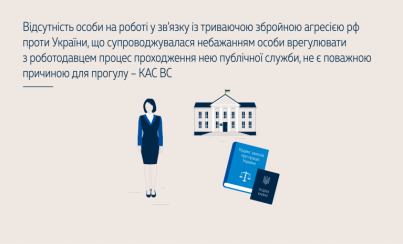 Відсутність особи на роботі впродовж тривалого часу (зокрема, внаслідок перебування за межами України) у зв’язку із триваючою збройною агресією рф проти України, що супроводжувалася небажанням особи подавати своєму роботодавцю будь-які заяви та звернення для врегулювання процесу проходження нею публічної служби (зокрема, заяви про надання відпустки без збереження заробітної плати без обмеження строку або про призупинення дії трудового договору), не є поважною причиною для прогулу.