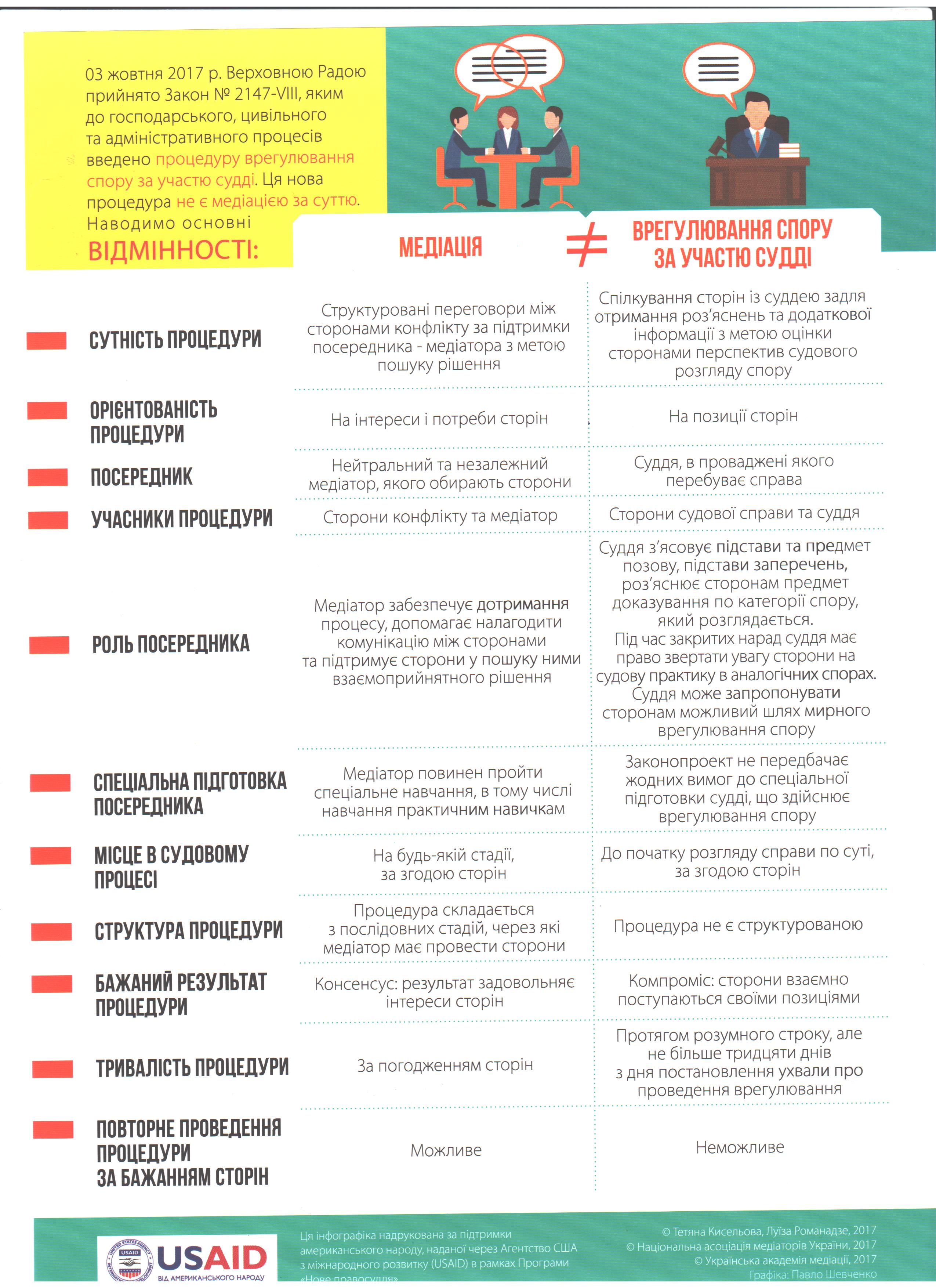 15.12.2017  набули чинності зміни (Закон № 2147-VIII), якими до господарського, цивільного та адміністративного  процесів,  введено процедуру врегулювання спору за участю судді. Ця нова процедура не є медіацією за суттю.