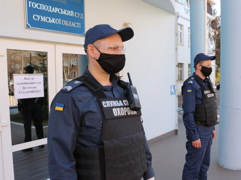 Судові охоронці несуть службу в захисних масках, окулярах і рукавичках, а кожний пункт пропуску забезпечений засобами для дезінфекції рук та предметів.