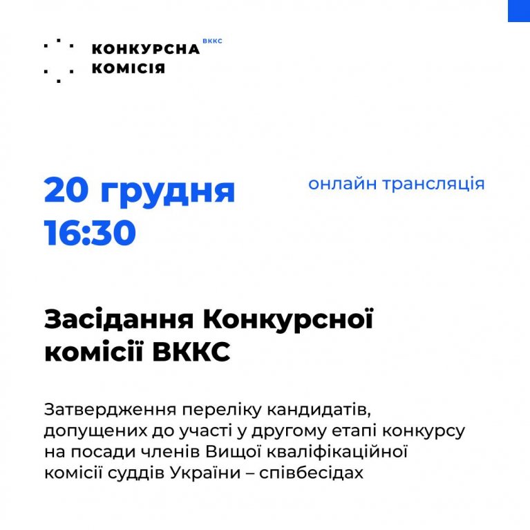 20 грудня 2022 року о 16:30 відбудеться офіційне засідання Конкурсної комісії з добору кандидатів на посади членів Вищої кваліфікаційної комісії суддів України (Конкурсна комісія). Під час засідання буде затверджений перелік кандидатів, які за результатами розгляду поданих ними документів та іншої інформації на предмет відповідності вимогам на посаду члена Вищої кваліфікаційної комісії суддів, будуть допущені до другого етапу конкурсу – співбесід. Офіційне засідання буде транслюватись в онлайн-режимі на офіційному сайті Вищої ради правосуддя та офіційних каналах Конкурсної комісії – Facebook та YouTube – українською та англійською мовами.